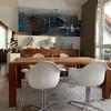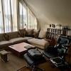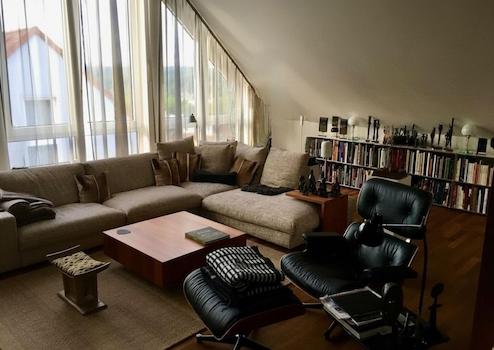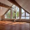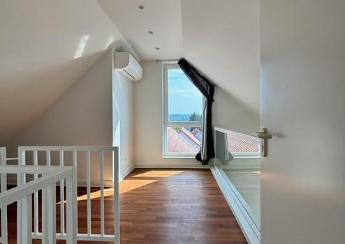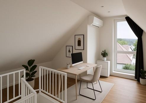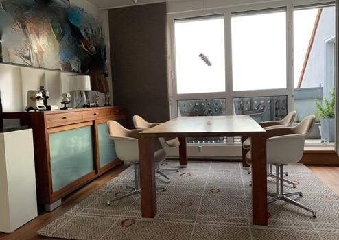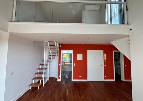 Eingangsebene: Großzügiges Entree / Essbereich. Hier erwartet Sie viel Licht und eine traumhafte Aussicht. Im nach oben hin offenen Essbereich ist viel Platz für einen großen Esstisch. Treppenaufgang zur oberen Ebene, Gäste-WC, Ausgang auf die Dachterrasse. In Loft-Art angeschlossener Wohnbereich mit raumhoher Giebelverglasung (4 Meter Raumhöhe), herrlichem grünem Blick und echtem Loft-Feeling. Studioebene: Galeriebereich mit fast bodentiefem Fenster (ideal für ein Homeoffice), die Galerie erschließt einen ca. 22 qm großen Raum (mit Klimaanlage), der baurechtlich jedoch wohnlich ausgebaute „Nutzfläche“ und keine Wohnfläche darstellt. Dieser Raum ist wie alle anderen Räume hochwertig und vollständig ausgestattet, so dass lediglich die baurechtliche Unterscheidung vorliegt.