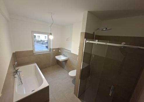 Badewanne, Dusche, Tageslichtbad, Fußbodenheizung, Einbauküche, Aufzug, Stellplatz, bodentiefe Fenster, Balkon, Neubau, Erstbezug, Gäste WC.