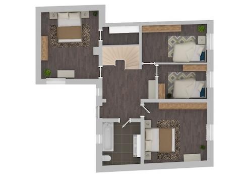 Im Obergeschoss befinden sich drei Schlafzimmer, ein Badezimmer und ein Abstellraum.