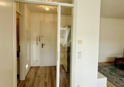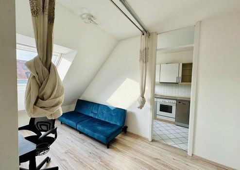 Die Dachgeschosswohnung begeistert dank großer Fensterflächen mit einer insgesamt sehr hellen und offenen Struktur. Über den Eingangsbereich gelangen Sie in das abgehende Gäste-WC sowie in den geräumigen Wohn- und Essbereich. Von hier haben Sie Zugang zur Sonnenterrasse in südwestlicher Ausrichtung. Die anschließende Küche bietet ausreichend Platz für geselliges Kochen und zum Stellen eines kleinen Tischs.