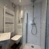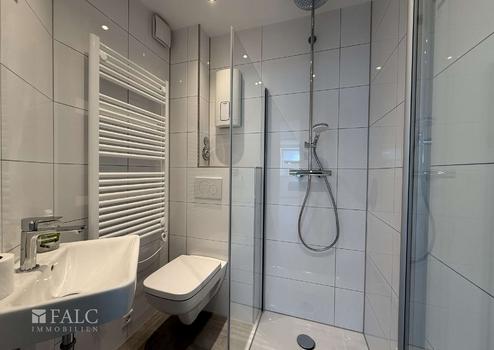 Schlafzimmer sowie ein hochwertig gefliestes Badezimmer mit einer ebenerdigen Dusche.