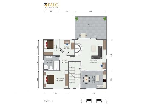 Das Erdgeschoss beherbergt eine besonders großzügige und hochwertig gestaltete Vier-Zimmer-Wohnung mit ca. 110 m² Wohnfläche. Herzstück dieser Einheit ist der offen konzipierte Wohn- und Küchenbereich mit Kamin, der eine warme und einladende Atmosphäre schafft. Von hier aus gelangt man direkt auf die große Terrasse, die einen herrlichen Blick ins Grüne bietet und zum Verweilen einlädt. Angrenzend an den Wohnbereich führt ein separater Flur zu einem Büro, einem Gästezimmer, einem Schlafzimmer sowie zu einem großzügigen Vollbad, das höchsten Wohnkomfort bietet.