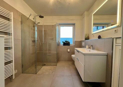 - Großzügige bodengleiche Dusche mit beheizter Sitzbank
