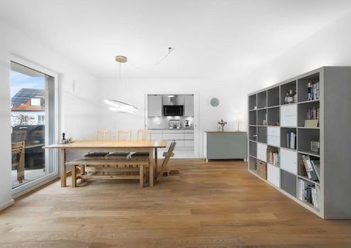 *Moderne Küche am Wohn- und Essbereich, per Schiebetür trennbar