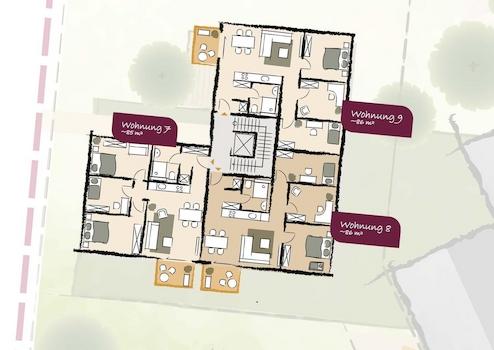 Im ersten Bauabschnitt des Klosterareals entstehen auf Baufeld B vier Mehrfamilienhäuser. Die Grundstücke liegen ruhig, direkt am Meulenwald – und dennoch bestens angebunden. Das Mehrfamilienhaus auf Baufeld B2 verfügt über insgesamt 9 Wohneinheiten mit einer Wohnfläche von je ca. 85m². Im aktuellen Baukonzept ist eine rollstuhlgerechte Wohnung im Erdgeschoss vorgesehen.
