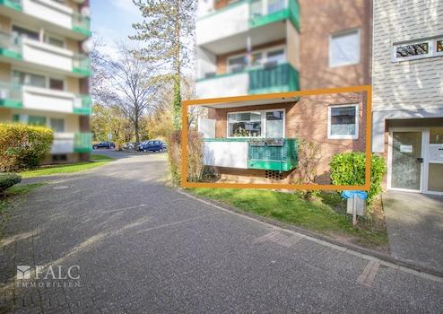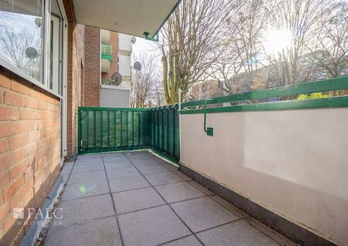 Ihre neue Wohnung befindet sich im höher gelegenen Erdgeschoss (Hochparterre) eines Mehrfamilienhaus an der Hünefeldstraße, Ecke Madrider Ring.