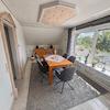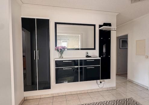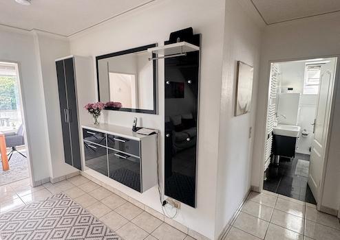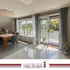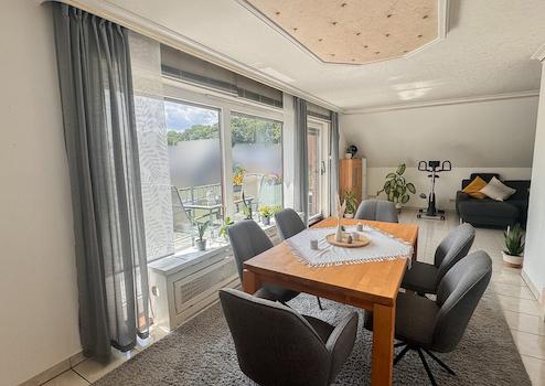 Das Wohn- und Esszimmer in L-Form ist mit zwei bodentiefen Fenstern, einer Glasschiebetür mit Rollladen und hochwertigen „Versace“-Markenfliesen ausgestattet. Stuckelemente in Säulenoptik und eine Decke mit Wickeltechnik prägen den Raum. Vom Wohnzimmer aus gelangen Sie direkt auf den Balkon in Südlage – ausgestattet mit einer elektrischen Markise und herrlichem Blick aufs Wurmtal.