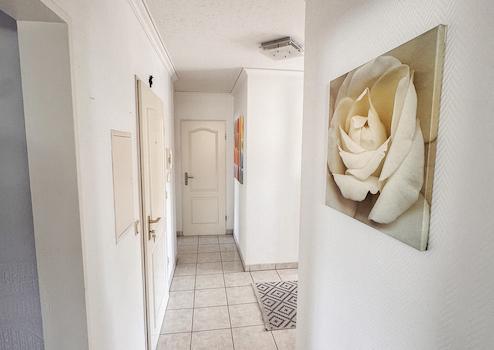 Ein kleiner Hauswirtschaftsraum innerhalb der Wohnung bietet zusätzliche Abstellfläche und beherbergt zudem die Gaskombitherme der Marke WOLF (Baujahr 2008), die ebenfalls für Warmwasser sorgt. Die monatlich zu erwartenden Heizkosten liegen bei etwa 80–100 €. Das Treppenhaus ist gepflegt – im unteren Bereich mit Spaltfliesen, im oberen Teil mit Teppichboden. Ein Stahlgeländer mit Kunststoffhandlauf, die weiße Wohnungstüre mit goldener Drückergarnitur sowie eine Gegensprechanlage vervollständigen das Gesamtkonzept der Immobilie.