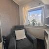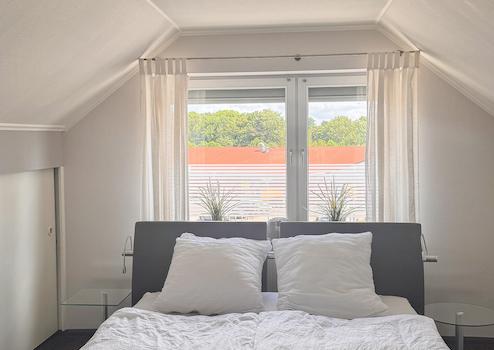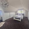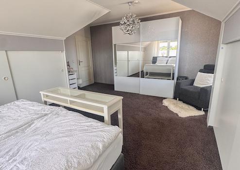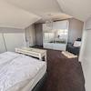 Das große Elternschlafzimmer bietet ausreichend Platz für ein Doppelbett und einen großzügigen Kleiderschrank. Zwei jeweils vier Meter lange Einbauschränke schaffen zusätzlichen Stauraum. Der Raum ist mit doppelt verglasten Fenstern ausgestattet; das zur Straßenseite gelegene Fenster verfügt über Rollläden. Der Boden ist mit braunem Teppich ausgelegt.