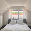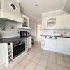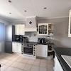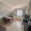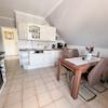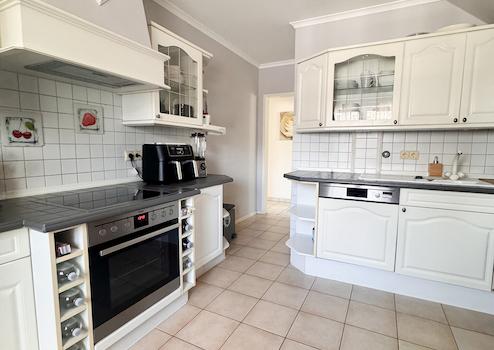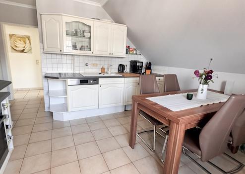 In der Küche befindet sich eine Einbauküche mit weißen Stilfronten, einer gefliesten Arbeitsplatte in Anthrazit, einem AEG-Backofen, einem passenden AEG-Ceranfeld und einem Kühlschrank. Die Küche verfügt über Abluft. Der Boden ist hellbraun gefliest (30 × 30 cm). Doppelt verglaste Holzfenster mit Marmorfensterbänken, ein weißer Fliesenspiegel (10 × 10 cm) sowie Strahler in der Decke gehören ebenfalls zur Ausstattung. Die Küche bietet ausreichend Platz für einen großen Esstisch und die Drempelhöhe beträgt ca. 130 cm.