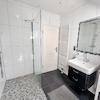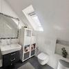 Das Badezimmer ist raumhoch mit weißen Fliesen im Format 30x60 cm versehen und verfügt über einen anthrazitfarbenen Fliesenboden. Ein Waschtisch, ein Hänge-WC von Geberit, eine Regendusche mit Glaswand sowie ein Handtuchheizkörper sorgen für Komfort im Alltag. Zudem finden sich hier der Spiegel mit grau-bläulichem Glasmosaik, eine marmorierte Wickeltechnik an der Decke sowie in die Decke eingelassene Strahler. Es handelt sich um ein Tageslichtbad mit Dachschrägenfenster, zusätzlich befindet sich hier die Kaltwasseruhr.