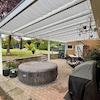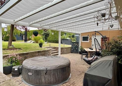 Vom Wohnzimmer aus geht man auf die Terrasse, welche ca. 32qm groß ist. Diese ist in einer Größe von 8m x 3,70m überdacht. Im Sommer kann man es sehr lange draußen aushalten, und bei schlechtem Wetter trotzdem die Wäsche draußen aufhängen. Es ist auch kein Problem in den Übergangsmonaten draußen zu sitzen, da der Garten etwas höher liegt (windgeschützt).