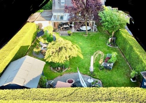 Über fünf Stufen gelangt man in den liebevoll angelegten Garten, der bereits mehrere Metamorphosen durchlaufen hat. Er verfügt über mehrere Loungebereiche, einen Schuppen für Gartengeräte und Holzlagerung und über ein Gartenhäuschen. Der Garten ist insgesamt mit 78m laufender Hecke eingefriedet.