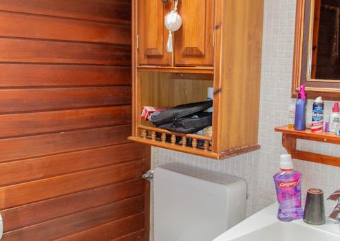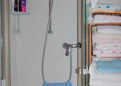 * Bad mit Dusche, Toilette, Waschbecken, Spiegel und Fenster