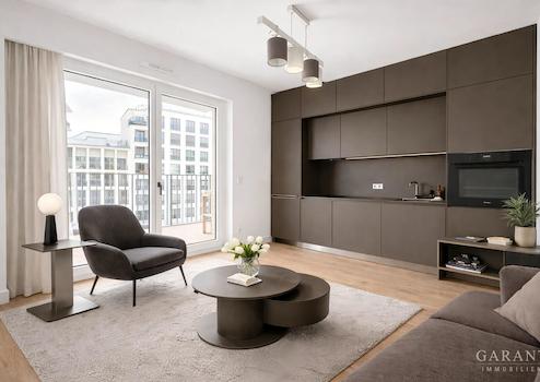 Dieses elegante 2 Zimmer-Apartment verbindet modernes Wohnen mit den Vorzügen eines hochwertigen Stadtquartiers. Bodentiefe Fenster, Eichenparkett und eine smarte Fußbodenheizung schaffen ein helles, behagliches Wohngefühl. Die offene Küche mit Markengeräten (Miele) fügt sich nahtlos in den Wohnbereich ein, ein überdachter Balkon erweitert den Raum ins Freie.