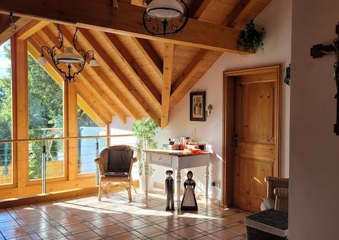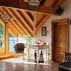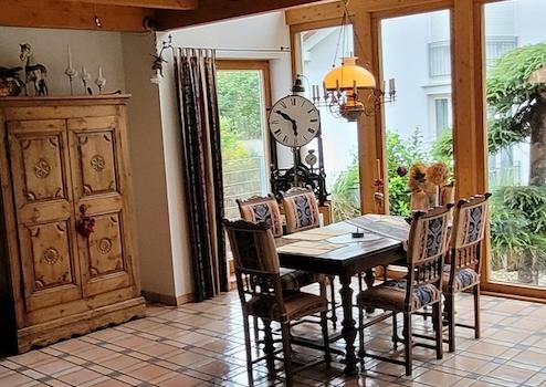 - Hochwertige und komfortable Ausstattung: EBK, Fußbodenheizung, zentraler Kaminofen, elektrische Rollläden und Garagentore, Holzbalken-Decken.
