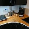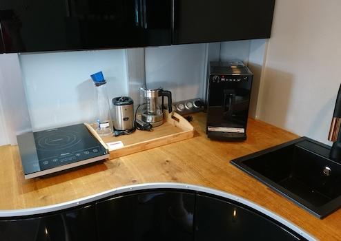 Die offene Küchenzeile ist mit einem kleinen Geschirrspüler, einem elektrischen Plattenkocher, einer Mikrowelle mit Backofenfunktion, einem Wasserkocher, einer Kaffeemaschine sowie sämtlichem Kücheninventar ausgestattet.