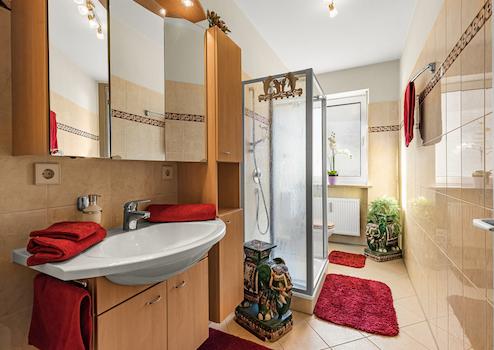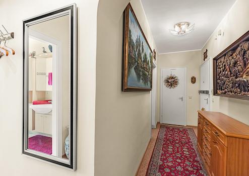 Der Eingangsbereich überzeugt mit einer praktischen Abstellkammer und einer langen Diele, die zum Badezimmer führt. Das helle, großzügige Bad ist mit einer Dusche ausgestattet und profitiert von natürlichem Lichteinfall. Dank der Westausrichtung erhält die Wohnung viel Tageslicht, wodurch eine freundliche und einladende Atmosphäre entsteht.