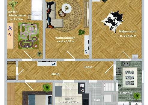 Die Raumaufteilung der vier Hauptzimmer ist durchdacht: Alle Räume weisen eine angenehme, gut nutzbare Größe auf. Praktischen Stauraum bietet die Diele, an deren Ende sich eine separate Abstellkammer befindet. Für zuverlässige und effiziente Wärmeversorgung ist die Wohnung mit einer modernen Gas-Zentralheizung ausgestattet.