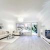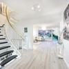Im Inneren des Hauses öffnet sich der Eingangsbereich in eine große offene Küche mit Essplatz. Ein modernes, neues Gäste-Bad mit weißen, zeitlosen Fliesen und Hänge-WC befindet sich ebenfalls im vorderen Teil des Hauses. Die offene Küche samt Essplatz geht nahtlos in das lichtdurchflutete Wohnzimmer mit großen Glasfronten über.