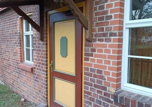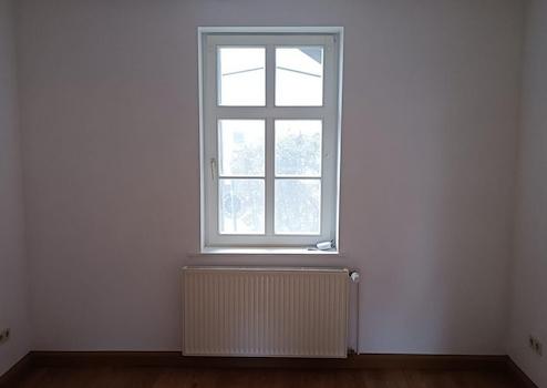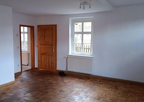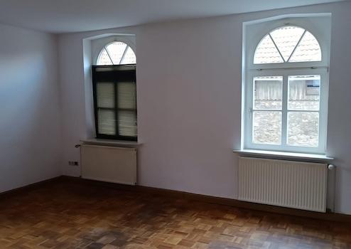 Helle Erdgeschosswohnung mit zwei großen Räumen in schönem Fachwerkhaus. Zwei Zugäng (von Garten und Straße), Gartennutzung möglich. Auto-Stellplatz im Hof, Kellerabteil, TV per Satellitenempfang.