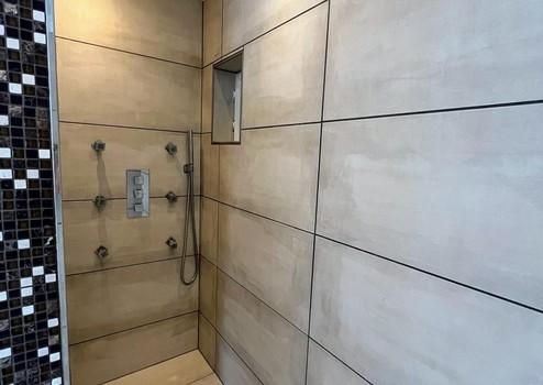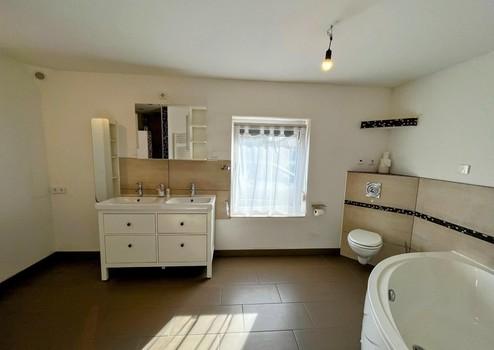 Das Badezimmer wurde komplett erneuert und ist großzügig ausgelegt. Es ist mit einer Eckbadewanne, Doppelwaschbecken und einer begehbaren Dusche ausgestattet.
