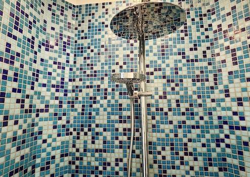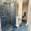 helles und sauberes Bad mit dekorativer blauer Mosaikfliese