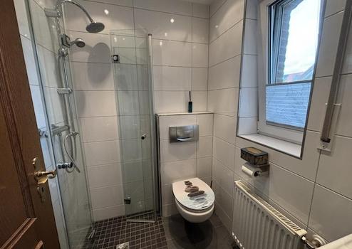 Das Gäste-Bad ist mit einer modernen Dusche und einem WC ausgestattet.