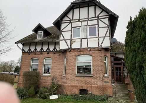 Zum Verkauf steht ein nutzbares Einfamilienhaus das voll Unterkellert ist und in Massivbauweise erstellt wurde. Das Dachgeschoss und die beiden Erkergiebel sind in Holzfachwerk gebaut worden. Ein Erkergiebel ist abgängig und müsste erneuert werden. Die Fenster sind aus Kunststoff mit Iso-Verglasung. Das Dach ist ein Satteldach mit Krüppelwalm, die Bedachung besteht je zur hälfte aus Betondachsteinen und Wellasbestplatten. Der Schornsteinkopf müsste erneuert werden.