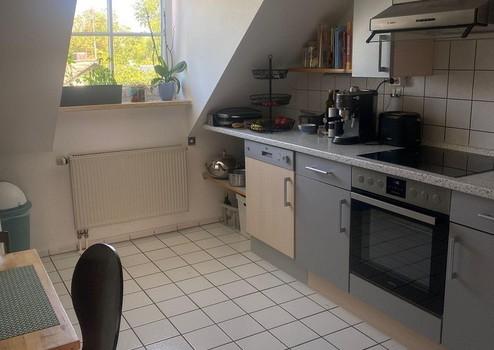 In der Küche mit Fliesenboden befindet sich eine Einbauküche, die kostenfrei übernommen werden kann.