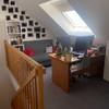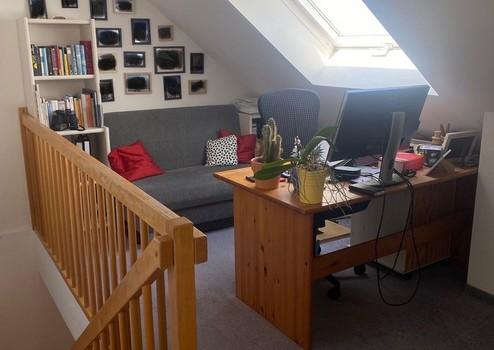Über eine Holztreppe im Eingangsbereich kommt man in die zweite Etage der Wohnung, in der sich ein großes Schlafzimmer, ein Bad mit Badewanne und WC und eine Galerie, die z.B. als Büro genutzt werden kann, befinden.