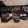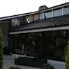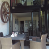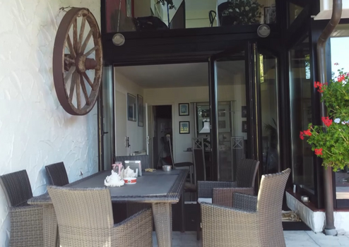 Über eine moderne stufenlose Faltschiebetür gelangt man vom Wohnzimmer direkt auf die überdachte und windgeschützte Terrasse mit Blick auf den schön angelegten Gartenteich mit Wasserfall.