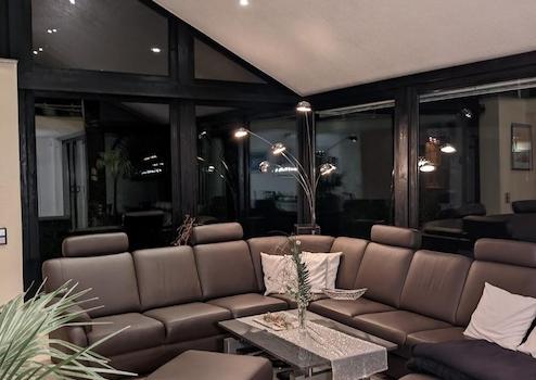 Im Erdgeschoss des Wohnhauses stehen Ihnen neben dem großzügigen Eingangsbereich die hochwertige Einbauküche mit Spülmaschine, Markeninduktionskochfläche sowie Side by Side Kühl/Gefrierkombi nebst Essecke mit Zugang zum Wohnzimmer und Abstellraum ( Hinterküche ), zwei Schlafzimmer, ein Büro mit Zugang zum Garten, ein großer Wohnbereich mit imposanter Fensterfront bis in den Giebel, mit Kaminofen, das Badezimmer mit Badewanne sowie Dusche zur Verfügung.