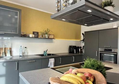 Im Erdgeschoss befindet sich ein großzügig, offen gestalteter Wohn- und Essbereich mit direkt angrenzendem offenen Küchenbereich. Im Wohnraum sorgt der Kaminofen für zusätzlichen Komfort. Die bodentiefen Fenster sorgen für sehr guten Lichteinfall und bieten einen direkten Zugang zur Terrasse und den Garten.