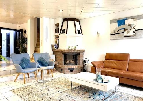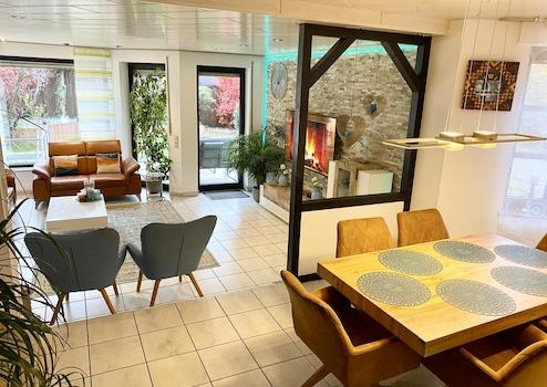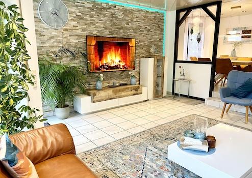 • Lichtdurchfluteter Wohnbereich mit Kamin