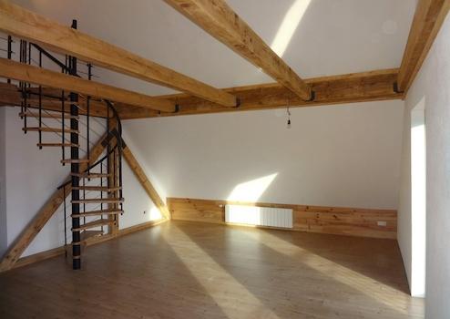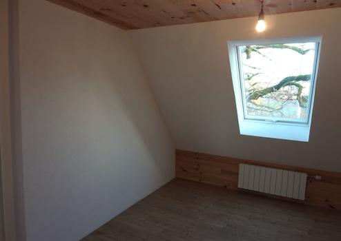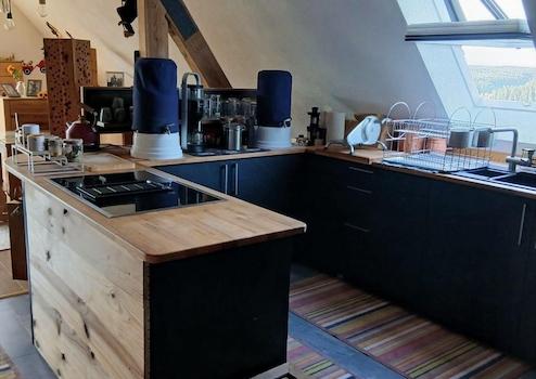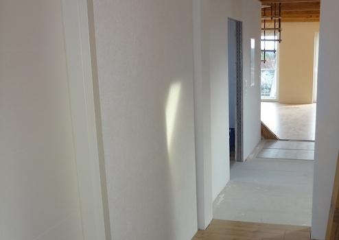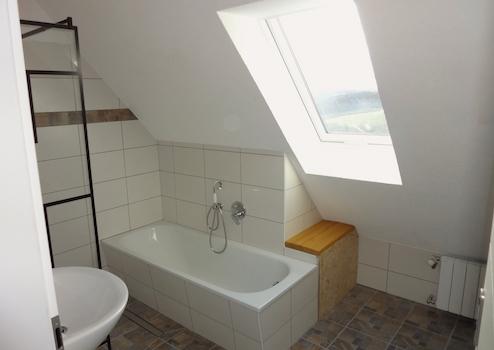 Umbau eines Bauernhauses durch einen Handwerksmeister. Die Wohnung ist komplett neu in der ehemaligen Scheune enstanden. Ökologische Bauweise, Holzfaserdämmung mit Mineralputz, viel unbehandeltes Holz. Neues Tageslichtbad mit Badewanne und Walk-In Dusche.