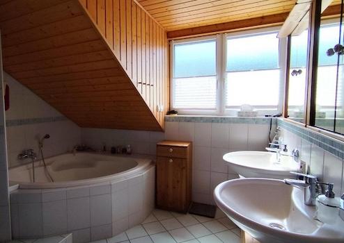 1 Bad gefliest, mit elektr. Fußbodenheizung, Etagenheizung, Dusche und Eckbadewanne, Fenster
