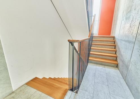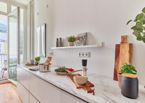 Markeneinbauküche ist bereits vorhanden. Marmorbad, Marmortreppenhaus, Holzbeplankte Terrasse und Balkon, Echtholzparkett, wegen der Raumhöhe bieten sich verschiedentlich Oberlichter an um das Tageslicht in der ganzen Wohnung über Zimmergrenzen hinweg zu verteilen. Verschiedene Bodentanks ermöglichen die Nutzung und Aufstellung von elektrischen Geräten.