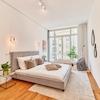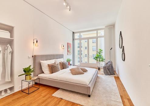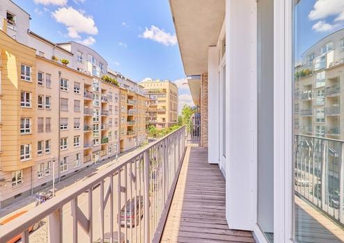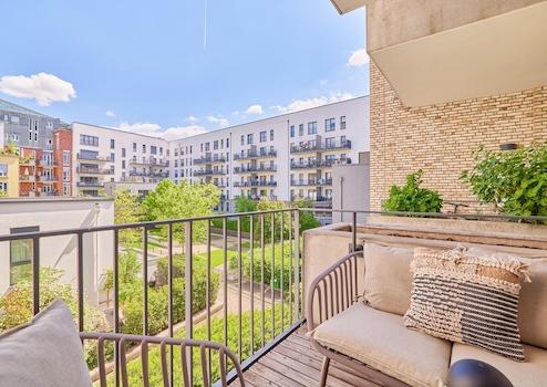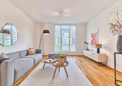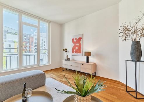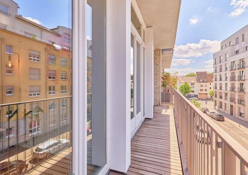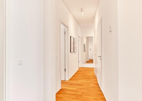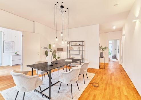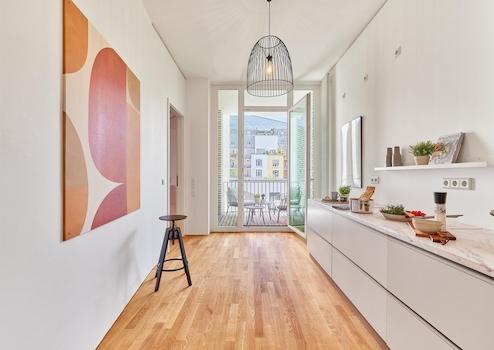 Coole, helle Wohnung die mit ihrem loftartigen Raumkonzept ist sehr großzügig konzipiert. Bodentiefe Fenster und eine großzügige Beleuchtung schmeicheln dem anspruchsvollem Raumkonzept = ist halt kein Standard. Die etwa 6 qm große schöne Terrasse bietet einen sehr schönen Blick in den ruhigen, weitläufigen, geschlossenen Innenhof. Der etwa 8 qm große Balkon erstreckt sich über die gesamte Wohnungsbreite und bringt die bodentiefen Fenster besonders zur Geltung. Außer in Küche und Nasszelle liegt überall Echtholzparkett. Mit den Bodentanks sind sie flexibel im Anschluss von Elektrogeräten.