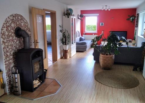 Wohnzimmer ca 40m2 groß aufgeteilt in TV/Sofa Bereich,Schwedenofen,