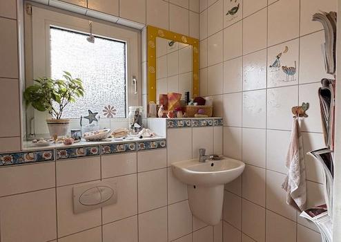 Die dritte Wohneinheit überzeugt mit einem offenen Wohn- und Küchenbereich mit Zugang zum Keller, der durch seine integrierte Essplatzlösung ein modernes Wohnambiente schafft. Ergänzt wird das Erdgeschoss durch ein Gäste-WC und einen kleinen Eingangsbereich. Im Obergeschoss befinden sich ein großes Tageslichtbad mit Badewanne und Dusche, ein Schlafzimmer und ein Kinderzimmer. Die Einheit ist vollständig unterkellert und ideal für Vermietung, Familienmitglieder oder Homeoffice-Konzepte.
