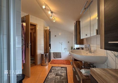 Das Dachgeschoss bietet zwei Schlafzimmer, ein zusätzliches WC sowie ein luxuriöses Badezimmer mit Eckbadewanne und Dusche – perfekt für ein komfortables Familienleben.