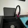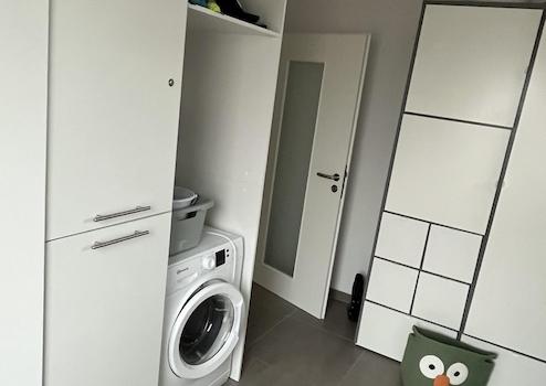 Im Erdgeschoss befinden sich ein Gäste-WC mit Dusche, ein großzügiger Haustechnikkeller (HWR) mit Waschmaschine und Trockner sowie eine Abstellfläche. Die Küche ist exklusiv ausgestattet mit nagelneuen Geräten. Das Wohnzimmer wirkt offen und lichtdurchflutet. Von hier aus gelangen Sie zur Terrasse, die einen kleinen, ausschließlich nutzbaren Gartenbereich umfasst.