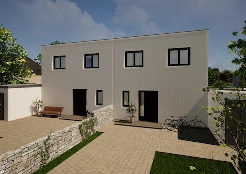 In Abstimmung mit einer Fertighausfirma wurden zwei unverbindliche Bebauungsvarianten entwickelt, die eine grobe Kosteneinschätzung und somit eine erste preisliche Orientierung ermöglichen. Für die angebotene rechte Grundstückshälfte wurde hierzu eine exemplarische Planung durch die Fertighausfirma erstellt, die in den dargestellten Grundrissen veranschaulicht wird.