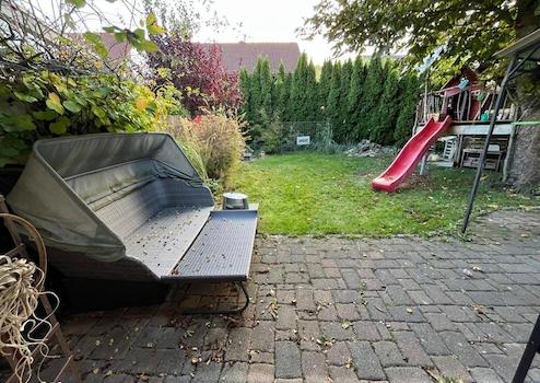 Im Außenbereich runden ein überdachter Fahrradabstellplatz hinter der Garage sowie eine praktische Tür in der Garagenrückseite das Angebot ab.