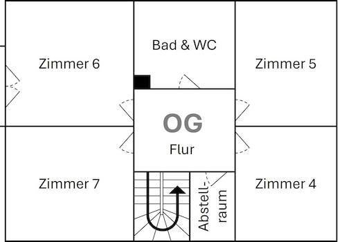 Die vorhandene Grundrissstruktur eröffnet die Option, das Haus in zwei separate Wohneinheiten aufzuteilen, z. B. durch eine Außentreppe zum Dachgeschoss.