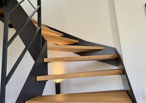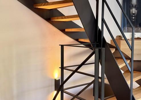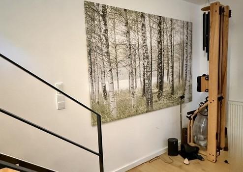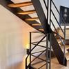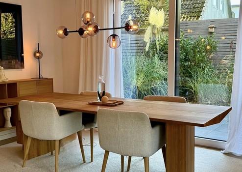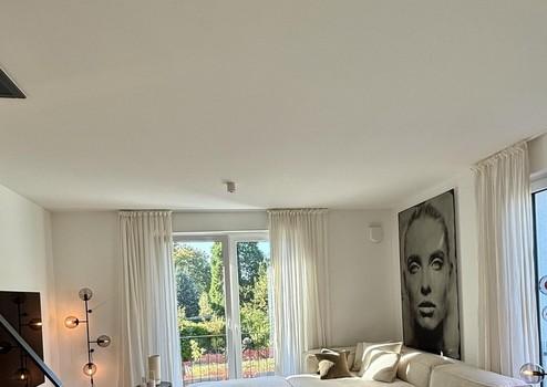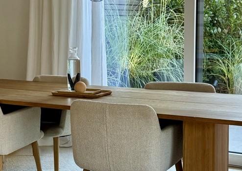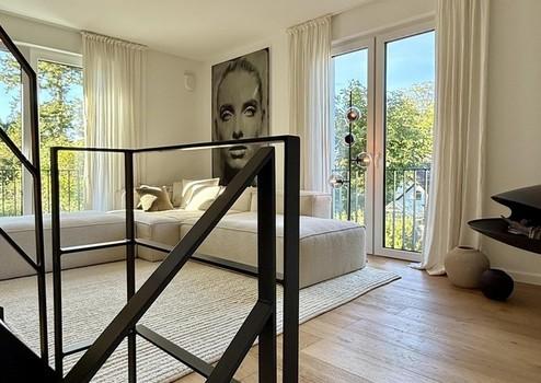 Das Haus steht als Endhaus in einem kleinen Vierer-Ensemble und wirkt durch seine offene Gestaltung sofort großzügig. Hohe Decken, große Fensterflächen und eine durchgehende Eichentreppe im Industriestil verbinden alle Etagen. Geölte Eiche und Natursteinfliesen setzen den warmen, modernen Akzent.