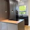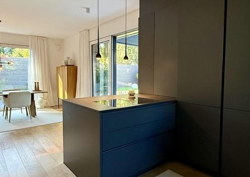 Offener Wohn- und Essbereich mit direktem Zugang zur Terrasse und zum Garten. Die moderne Einbauküche in Anthrazit matt ist hochwertig ausgestattet. Bodentiefe Fenster geben viel Licht und öffnen den Blick in den Außenbereich. Zusätzlich gibt es ein Gäste-WC sowie einen separaten Garderobenraum.