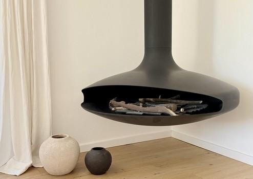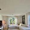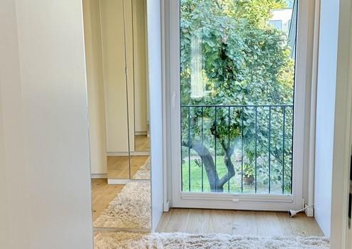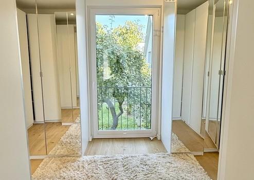 Wohnraum mit Kamin und Blick ins Grüne. Direkt daneben ein abgeschlossener Raum, der als Ankleide genutzt wird und sich auch als Arbeitszimmer oder Kinderzimmer eignet.