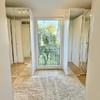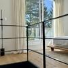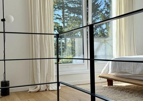 Heller Schlafbereich mit Zugang zur Dachterrasse. Auf derselben Ebene befindet sich ein großes Duschbad mit bodentiefem Fenster und WC. Schlafen und Bad bilden hier eine private Etage.